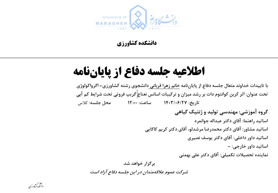 جلسه دفاع از پایان نامه کارشناسی ارشد، گروه مهندسی تولید (زمان دفاع:سه شنبه، 27 شهریور 1403) - دانشکده مهندسی کشاورزی دانشگاه مراغه