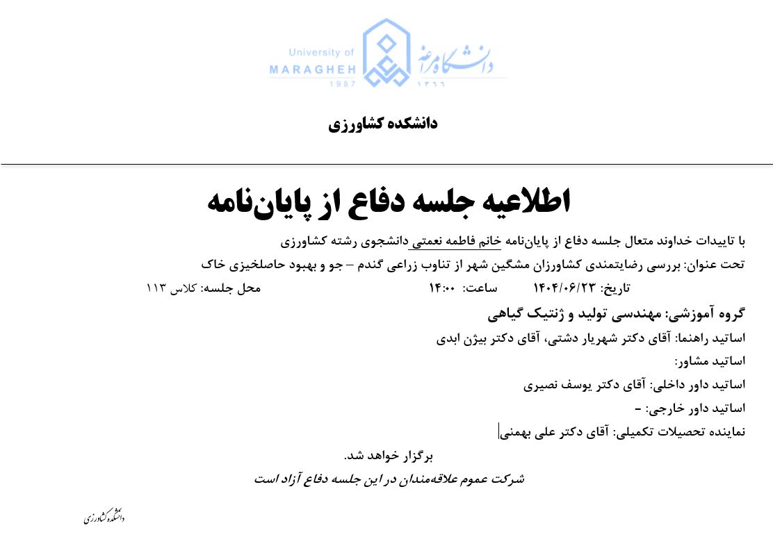جلسه دفاع از پایان نامه کارشناسی ارشد، گروه مهندسی تولید (زمان دفاع:یکشنبه 23 شهریور 1404) - دانشکده مهندسی کشاورزی دانشگاه مراغه
